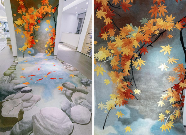 這款手工槍刺地毯以純羊毛和真絲為材料,前后經十幾道工序加工制作而成,品質上乘,彰顯主人高雅的品位與格調。池中金魚栩栩如生、清新自然,為家居空間注入無限活力,有效緩解了冬日的沉悶。