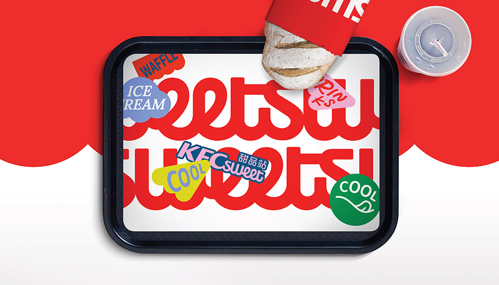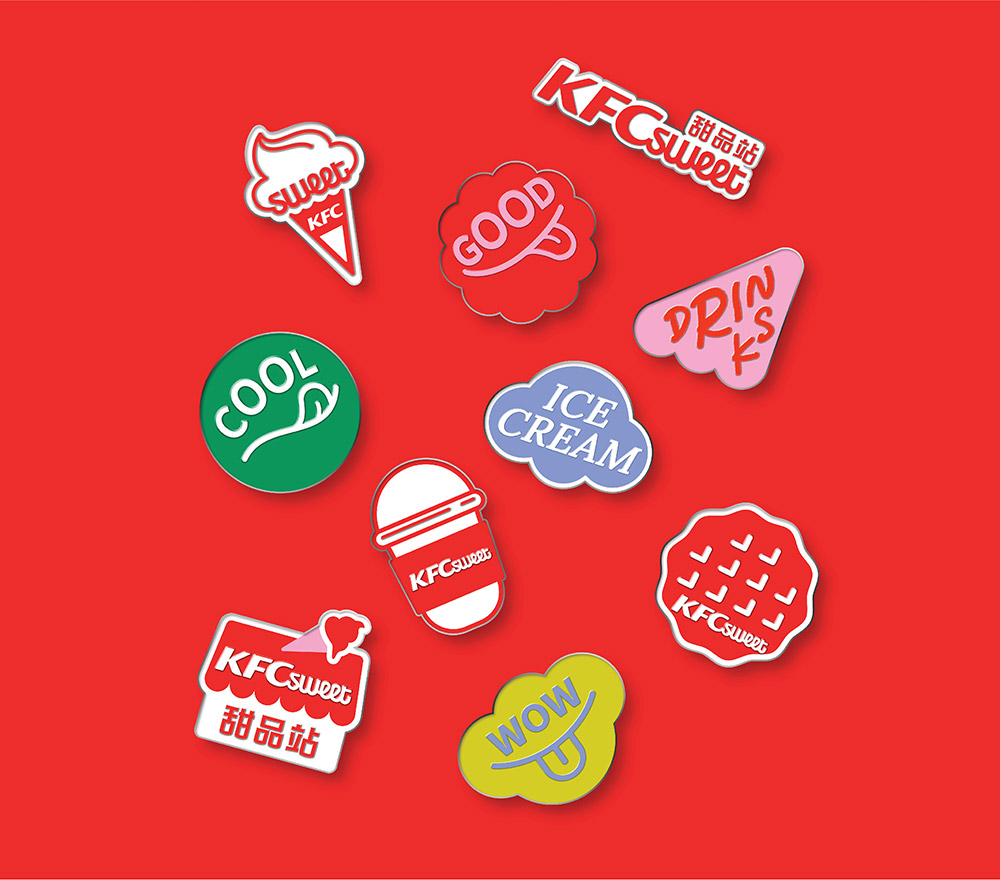全新的視覺形象傳承了主品牌KFC的視覺印象,采用連續(xù)的弧線元素,在視覺印象上與甜品的屬性產(chǎn)生了強(qiáng)關(guān)聯(lián),并且依然保持了肯德基獨(dú)具特色的紅白相間條紋。既與母品牌保持了一脈相承的調(diào)性,又表現(xiàn)出了圖形元素來自于甜品站雨棚這一創(chuàng)意概念,巧妙的將品牌傳承與創(chuàng)新概念相結(jié)合。