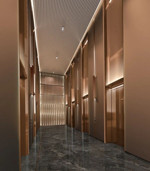 電梯大堂立面的復雜折疊賦予了材質之間不同定點的獨特連接。為了在視覺上使立面更纖細和統一,團隊設計了精巧的金屬外殼系統,在同色古銅金屬材質采用不同紋理及肌理搭配,完美地整合了結構連接的視覺弱點。纖細的設計語言突出視覺高度,回應了幕墻的古銅色和高品質愿景。