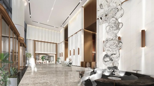 KWG商業設計團隊與知飾設計共同定制設計了5A寫字樓這座31層建筑的大堂、主廳、零售區域、標準層的設計方案,并為公共空間的設計建立了新的尺度及標準。墻身運用大理石折疊錯落的肌理感盡顯室內大堂的設計磅礴大氣,身臨其境可體驗空間的豁然放飛及尖端品位的空靈之感。