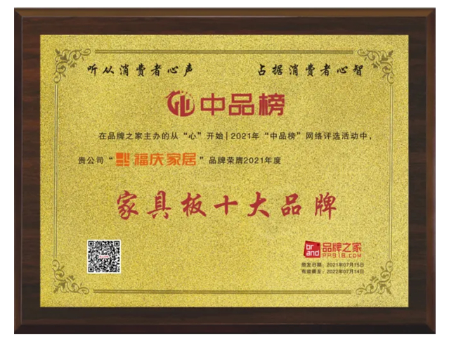 福慶家具板榮獲2021“家具板十大品牌”稱(chēng)號(hào)