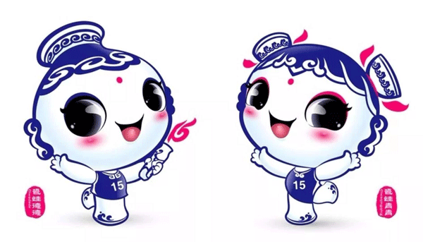 這是一對活潑可愛的卡通人物組成,其中男的叫瓷娃德德,女的叫瓷娃青青。作品以景德鎮瓷器為藍本,德德昵稱源于景德鎮城市名中的“德”字,青青昵稱源于景德鎮的青花瓷。德德手拿印有運動人紋樣的瓷器火炬,火焰呈15字樣,青青張開雙臂,熱情親切,喜迎四方來賓,吉祥歡樂,動感富有朝氣。呆萌可愛。德德和青青整體形象好像正漫步向前,朝人們熱情招手,喜迎運動盛會。